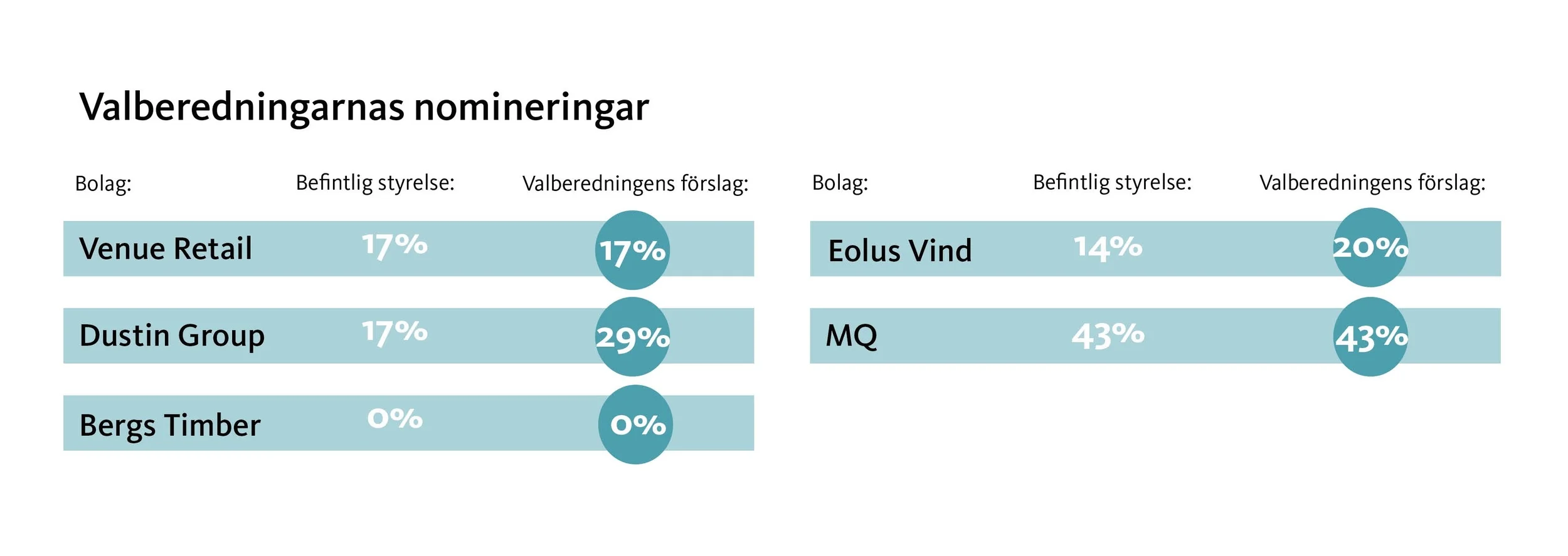 Fem bolag har redan hållit sina årsstämmor, två av dem har bidragit till en ökad andel kvinnor. Energibolaget Eolus Vind har minskat antalet ledamöter och därmed höjt andelen kvinnor, medan IT-återförsäljaren Dustin har ökat andelen kvinnor genom att välja in styrelseproffset Gunnel Duveblad. Venue Retail, MQ och Bergs Timber har slumrat till och inte gjort några förändringar i styrelserna.